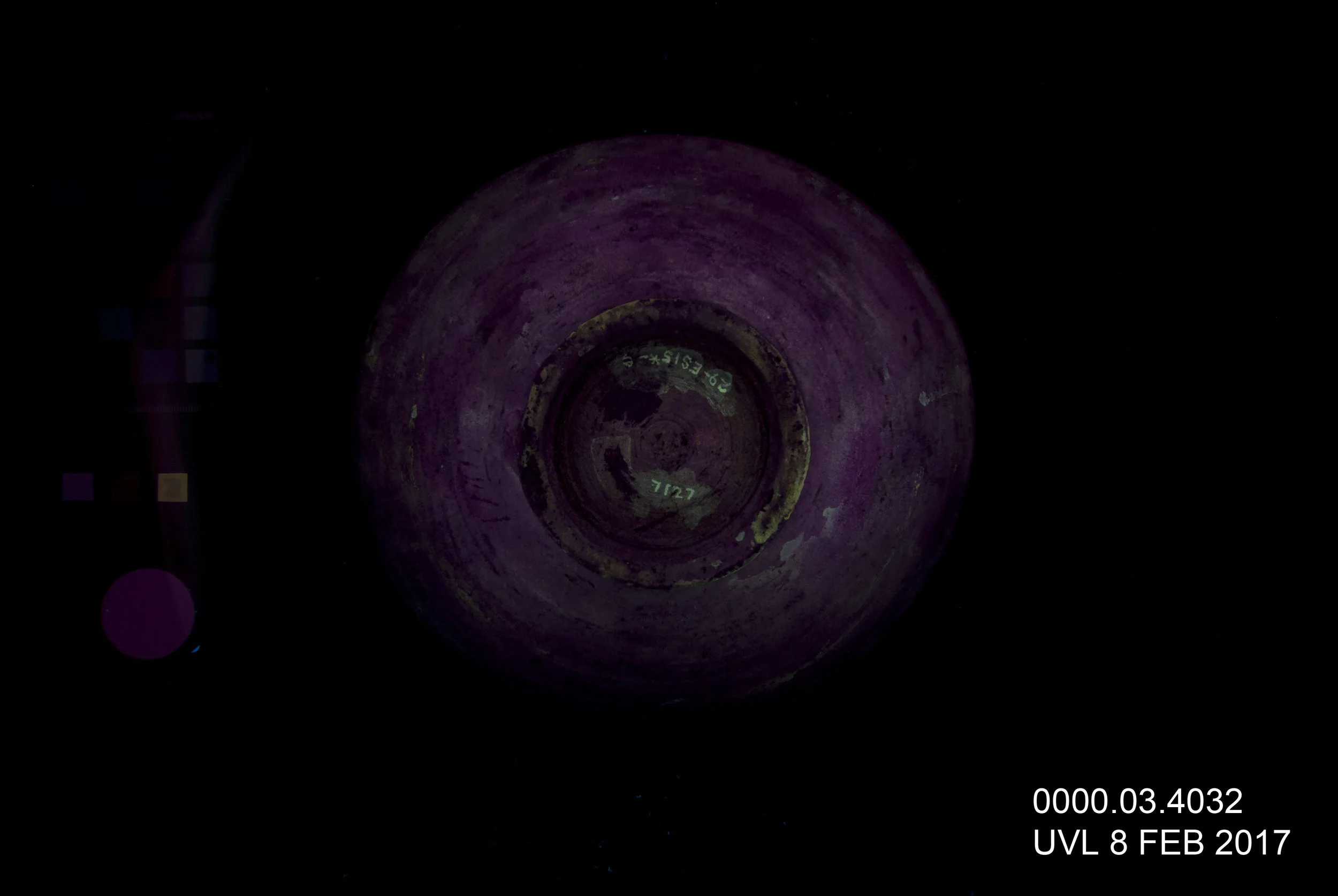 Performed test for cellulose nitrate using diphenylamine by taking small chip from surface and a swabbed section of the bowl. Both swab and chip reaction produced a deep blue color, meaning the surface tested positive for cellulose nitrate. Performed test for chlorides using silver nitrate. Brushed sample from interior of bowl reacted with silver nitrate and produced an opaque, white color, resulting in positive result for presence of chloride.