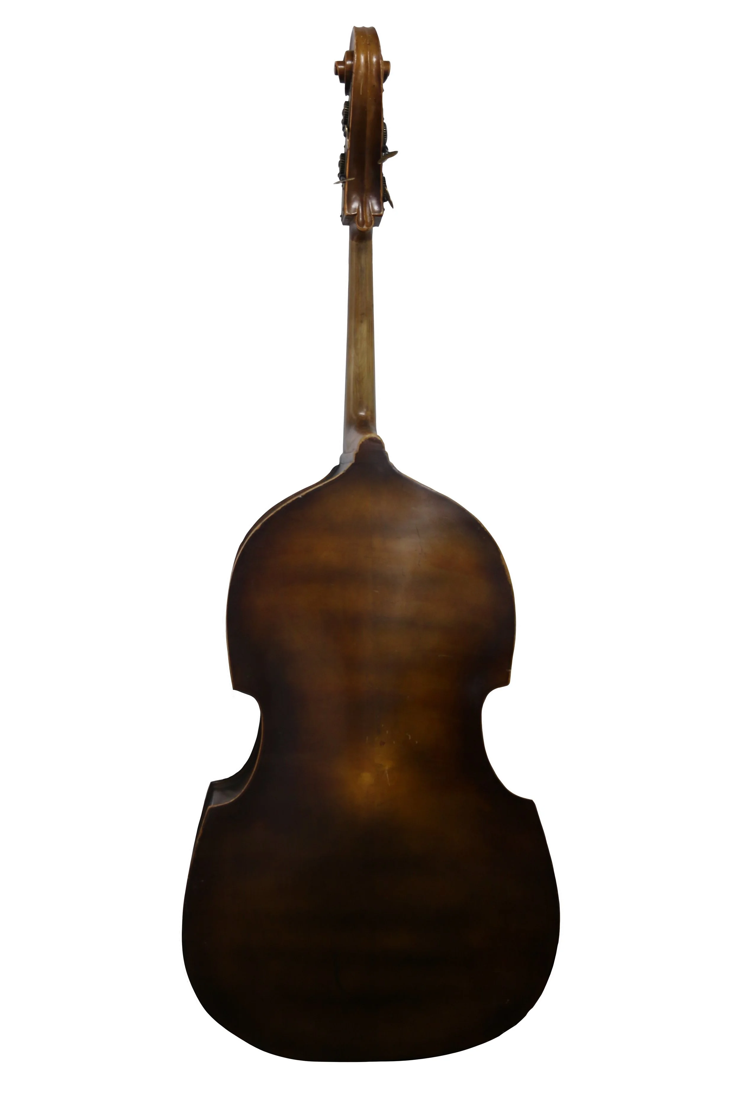 Double Bass is in fair condition overall, structurally sound but evidence of previous damages to monitor and remain cautious of. Base of instrument possesses the most damage, with losses, splintering, and abrasions along the edges and body. Damages are a mixture of old and new, but largest losses appear newer. Source of damage or when it occurred is unknown. Base of tailpiece is abraded with noticeable losses to the black toned finish. Finger board is sound but has losses to the finishes underneath the strings. Upper section of tail piece is in good condition and all strings are recently string and a safe tension for extended display.