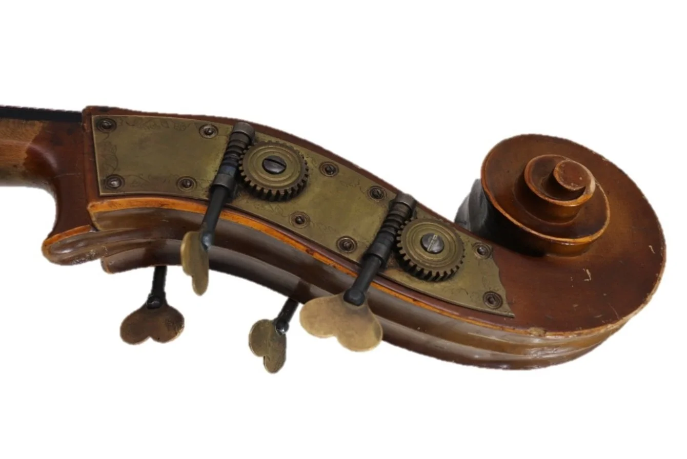 Head of instrument is in fair condition and strings are in good condition and properly strung. Previous break occurred between head and neck of instrument approximately 30 years prior. Head was reattached using hide glue and the repair was recently reassessed and new adhesive was applied between 2018-2019 by a restorer. Repair is currently stable but should be carefully handled. Brass hardware is in good condition and has a natural patina.