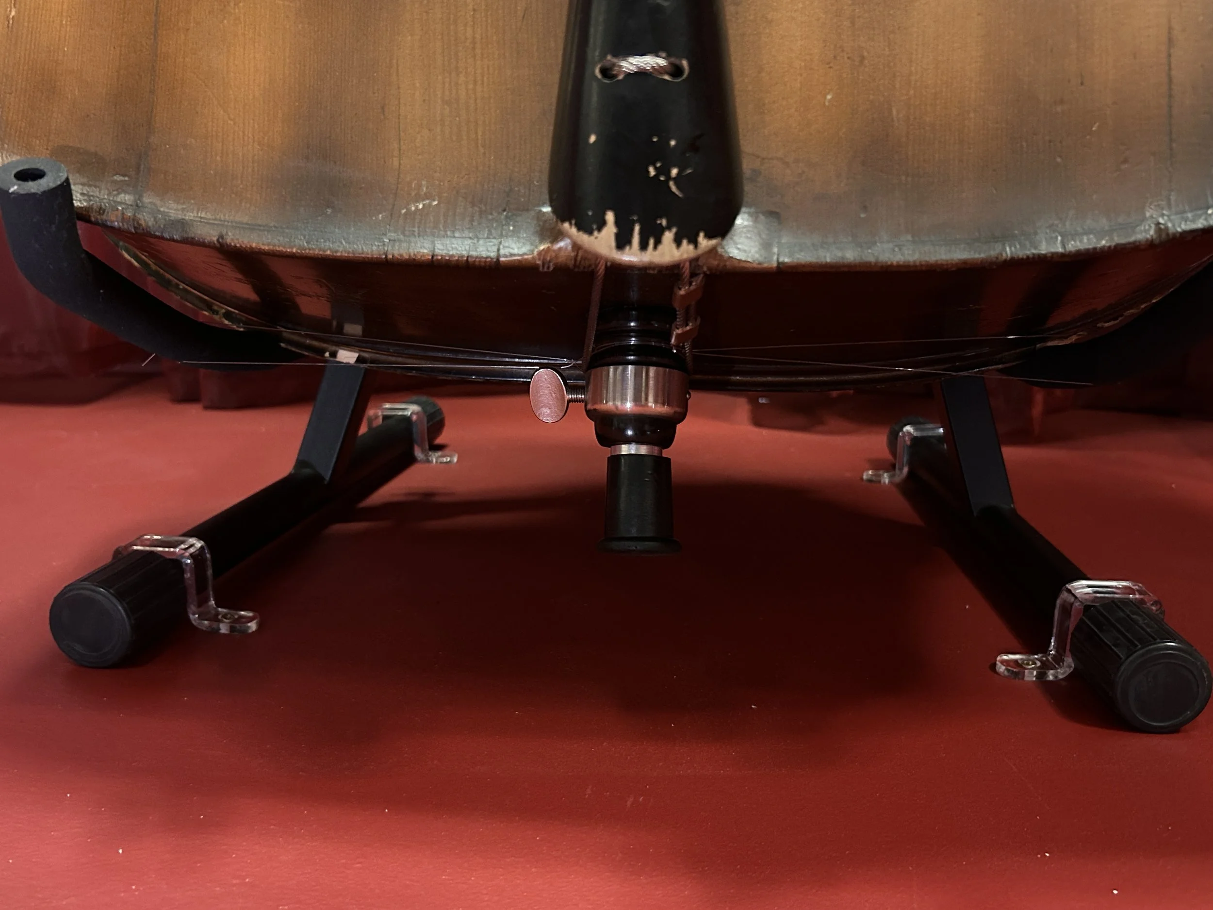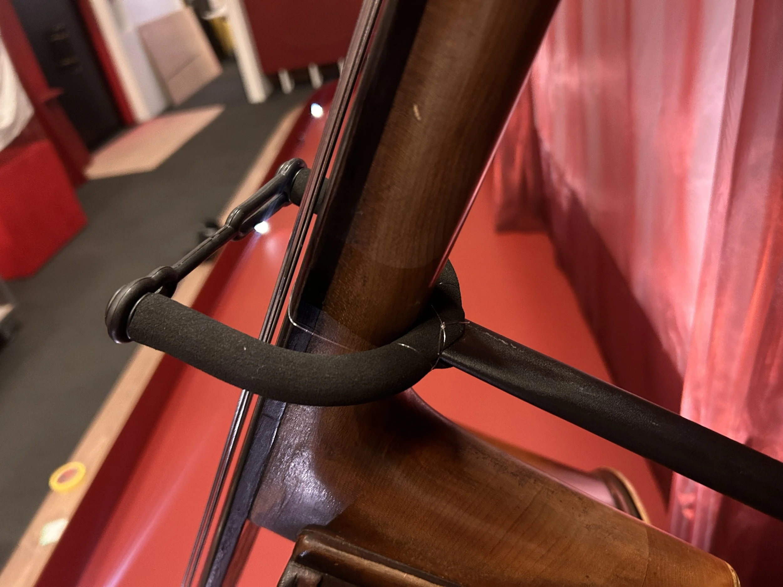 Double Bass was transported in a soft case to site on 9 April 2024 and installed on 10 April 2024. In assessing the instrument, there was no change in physical quality from previous condition assessment. Instrument was installed in floor stand with padded supports. Stand was secured to floor with screws. The neck of the instrument was reinforced to the mount using clear fishing line to ensure the object did not move out of place during the exhibition. Instrument was contained in a perspex display case with an environmental monitor located inside.