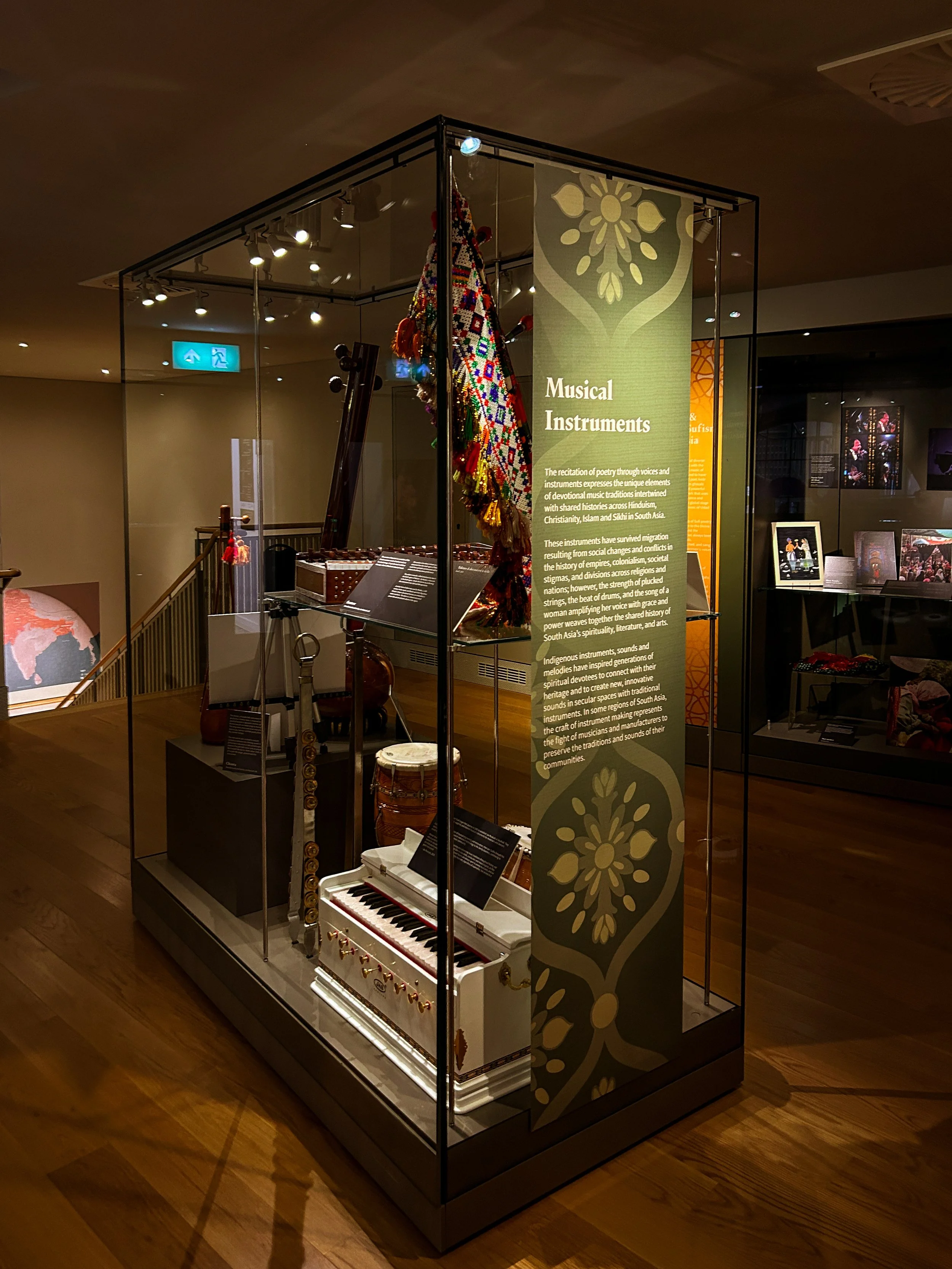 2024 - AWAKEN: Sufi Music & Women of South Asia - Displayed at the Royal College of Music Museum. It explores the legacy of Sufi music and the art of South Asia. Diligent research went into the panel designs, with inspiration coming from traditional textiles and architectural patterns from each region explored in the exhibition. The vibrant content stands alongside the bold instruments, clothing, and imagery, inviting visitors to delve into the rich history of this topic.
