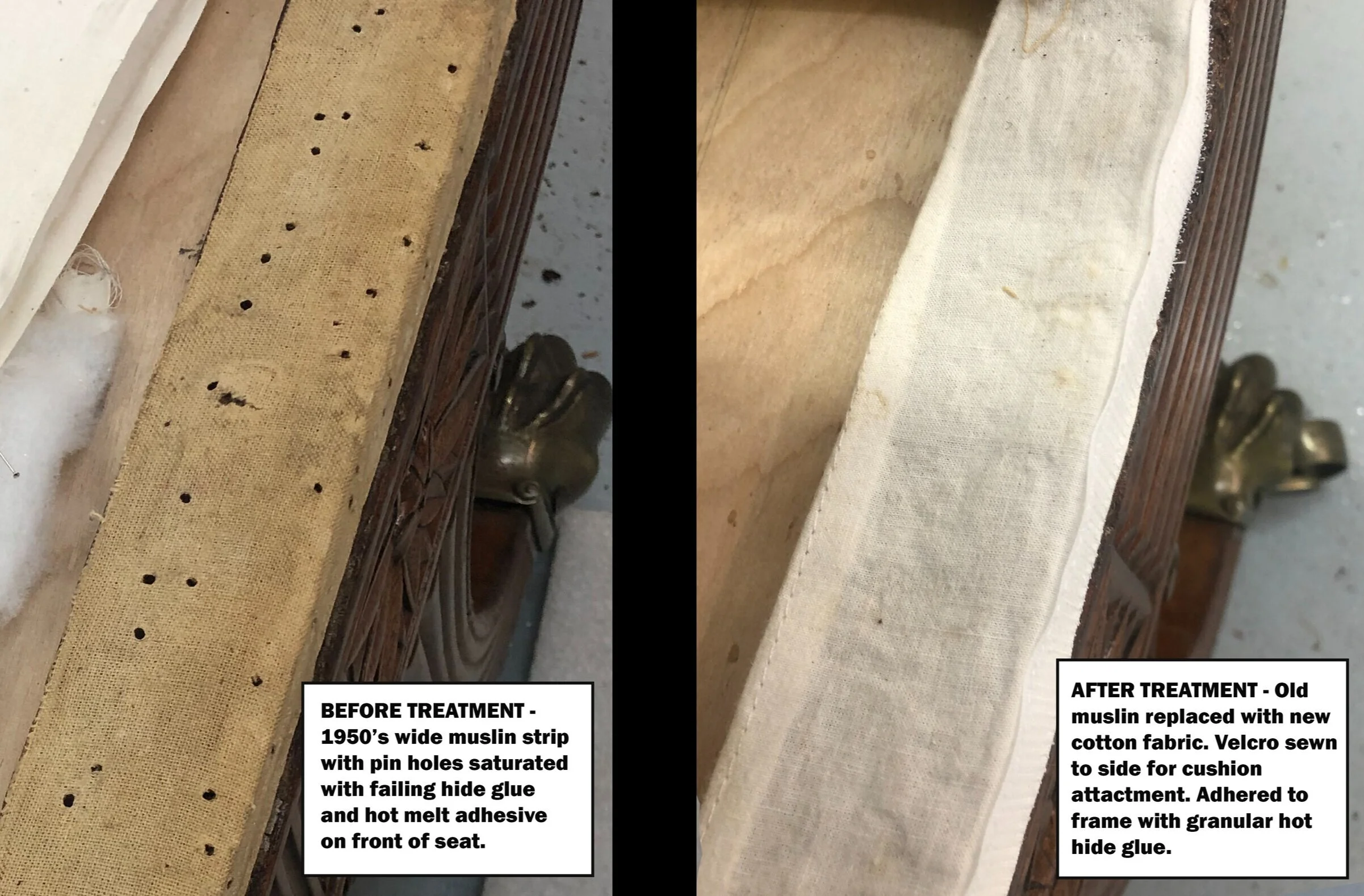 While this decision to use a safer, reversible upholstery detachment was sensible, the method of doing so has failed structurally on the entire item. Twill tape had been adhered to edges of the frame using granulated hot hide glue and acted as a barrier between the wood and the Velcro. Older muslin strips of fabric remain on the headrest and wide front edge of the object and are greatly degraded.