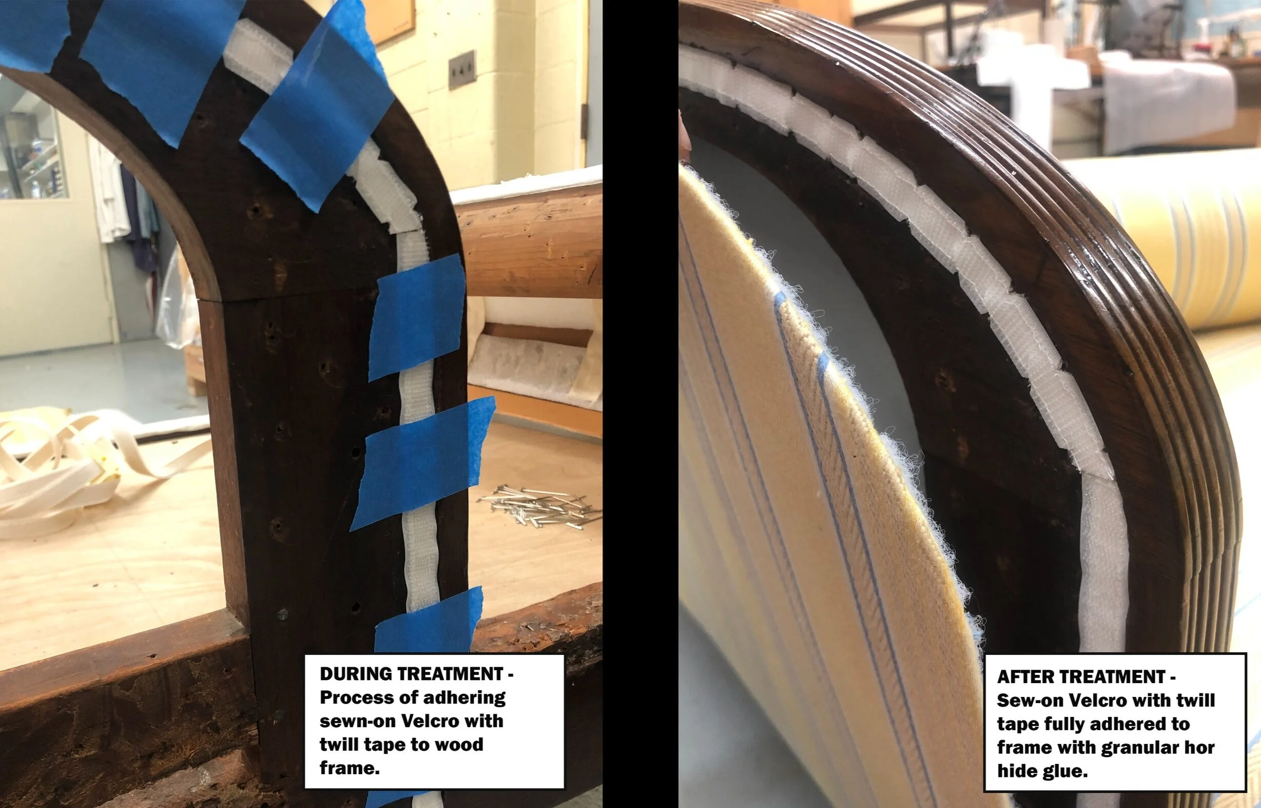 The pitted edges of the headrest were filled with a mixture of granulated hot hide glue and sawdust (1:1 mixture) to make them more stable for the new twill tape/Velcro. To prevent the Velcro from failing more immediately, a new method was used. Initially, it was evident that mechanically sewn on Velcro provided the strongest bond while still being a fully reversible treatment. Additionally, the use of granulated hot hide glue to attach the initial twill tape was successful overall. The new method of attachment combines these two techniques to make for a durable, yet reversible Velcro adhesion to the wood frame.