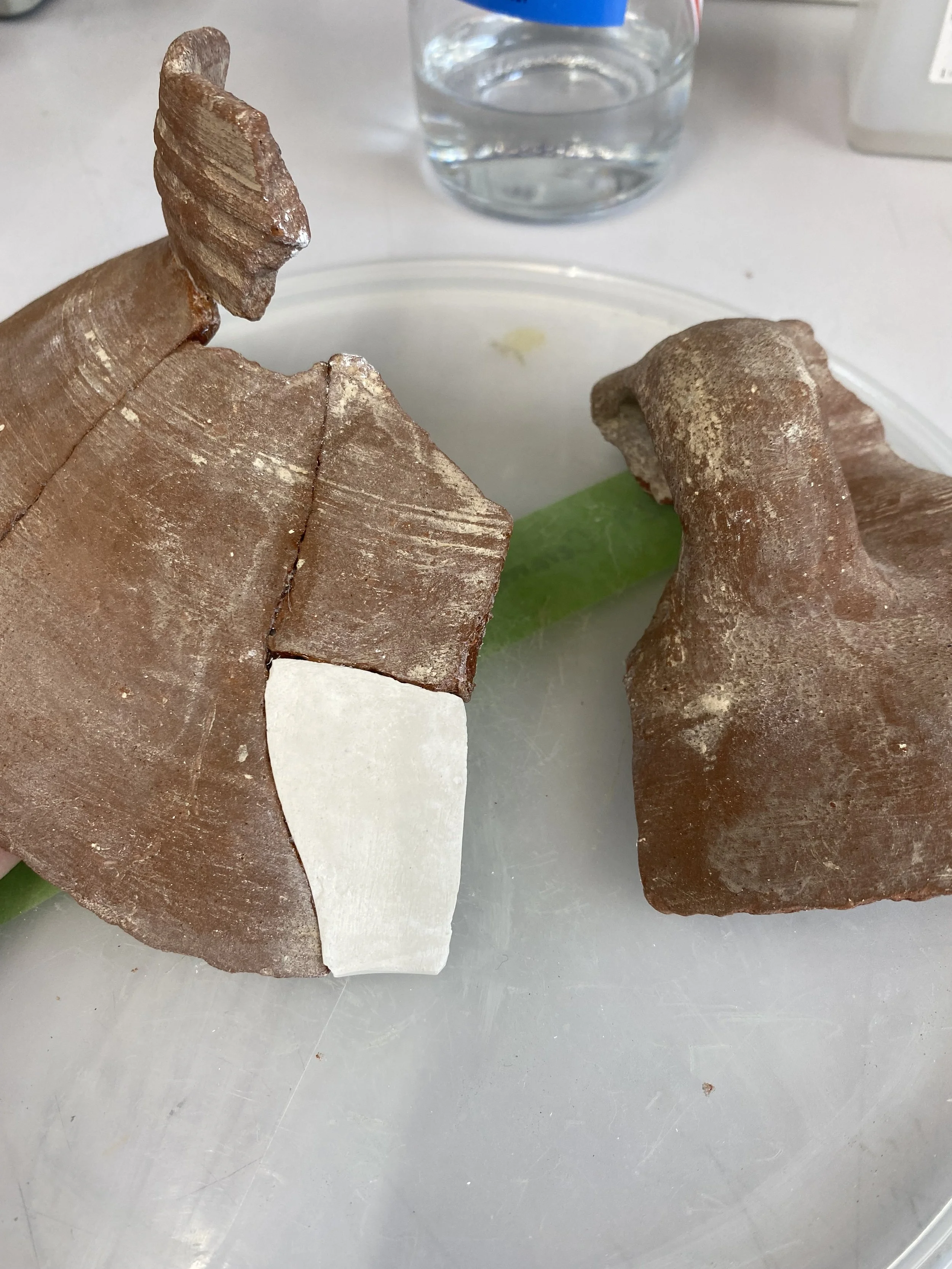 Using plaster of Paris, the first fill near the base was made then attached to the vessel. Once attached, the fifth and final fragment of the object was reattached. The two part fill was completed afterward and attached using Paraloid B-72 (60% w/v in acetone).