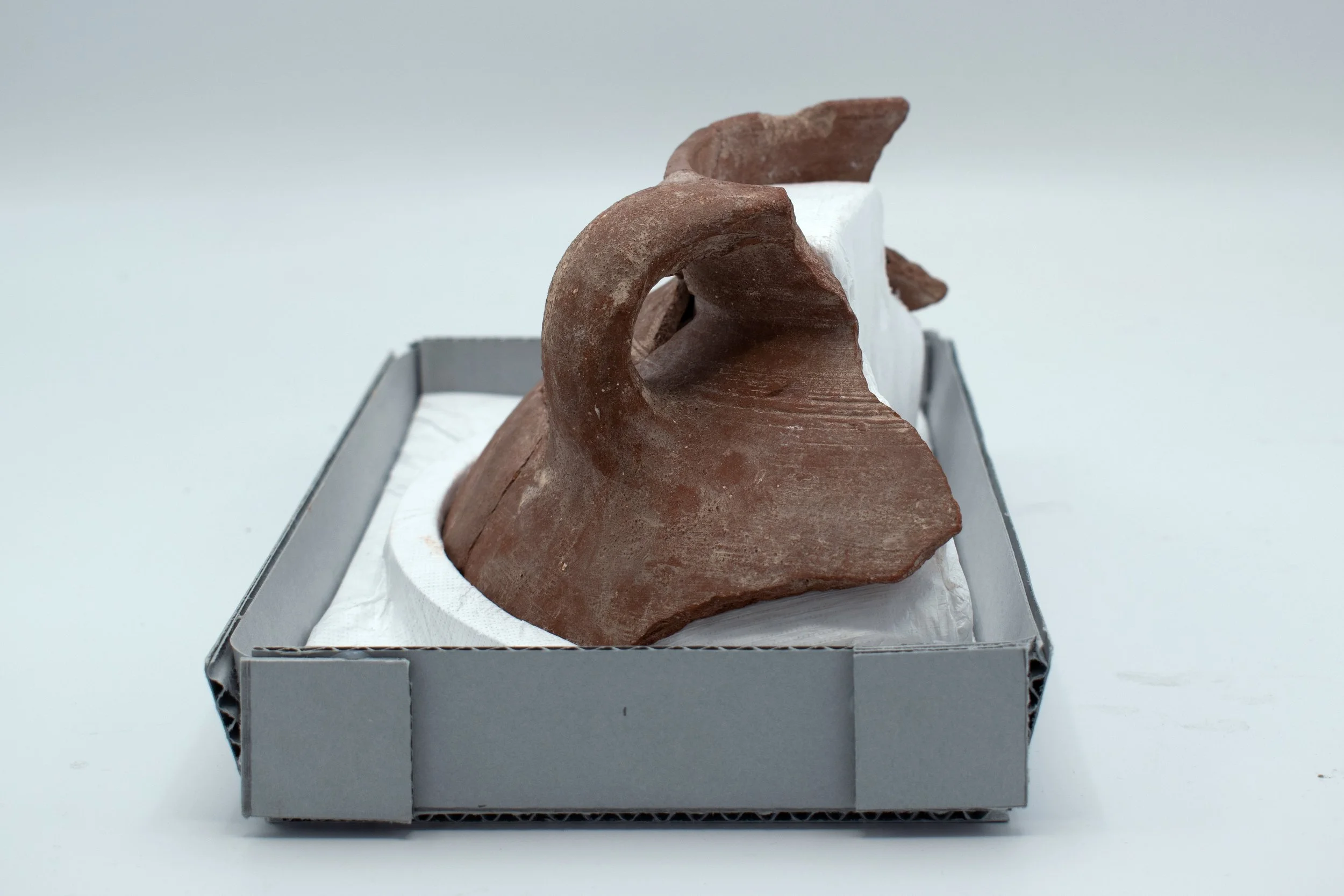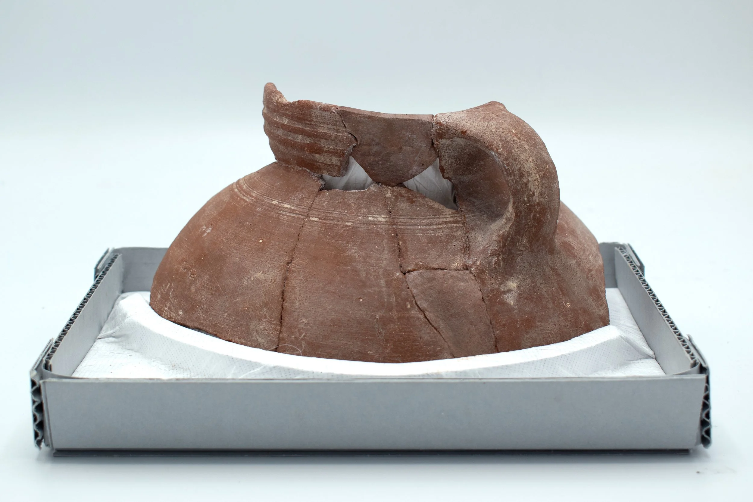 Due to its curvature, shape, and inability to stand upright, a support was made to protect the object from damage in storage and encourage safe handling.