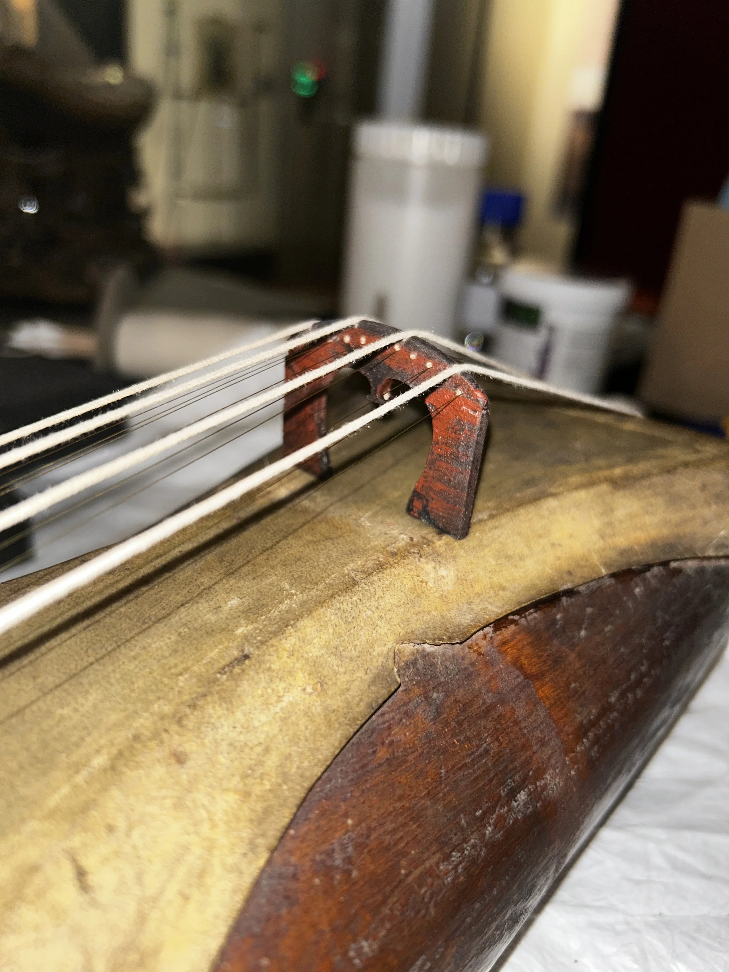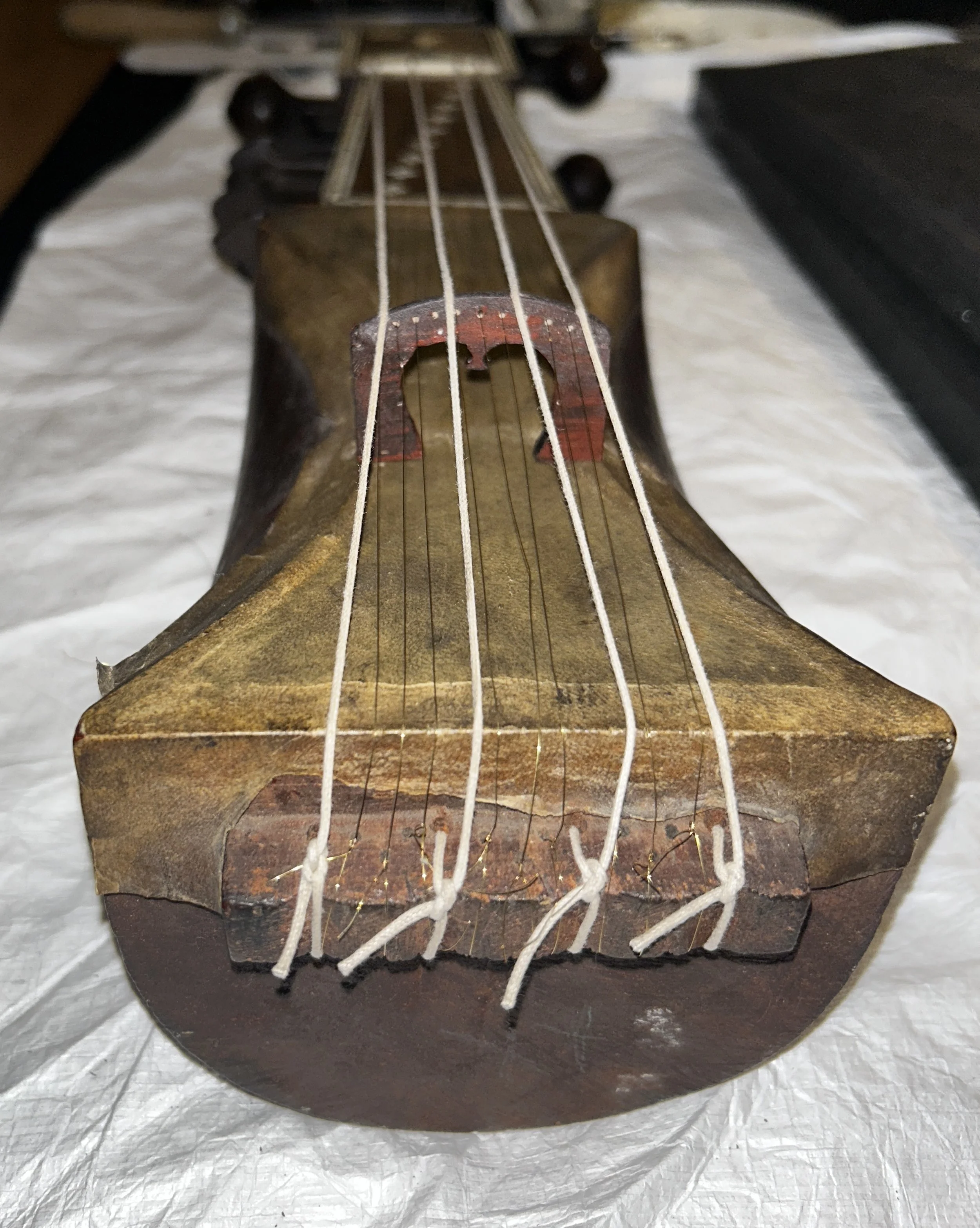 Instrument was strung for the purpose of temporary exhibition with reproduction tinted tan silk cord to mimic original strings. Brass strings were also strung on instrument. Tension was kept at a minimum to not produce any unnecessary strain or damage.