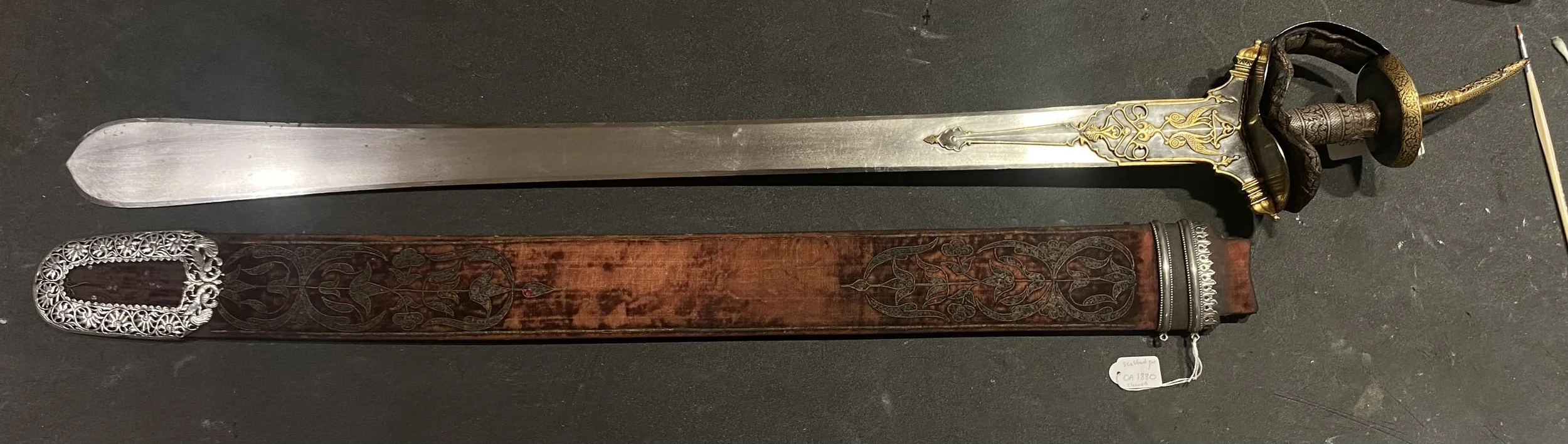 Treatment: Sword - Steel surfaces were wiped using white spirit then cleaned using IMS and cotton wadding. Grease was removed using cotton swabs and IMS. Two coats of Renaissance wax were applied.