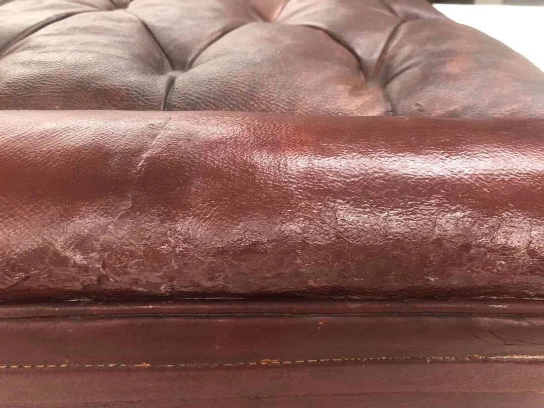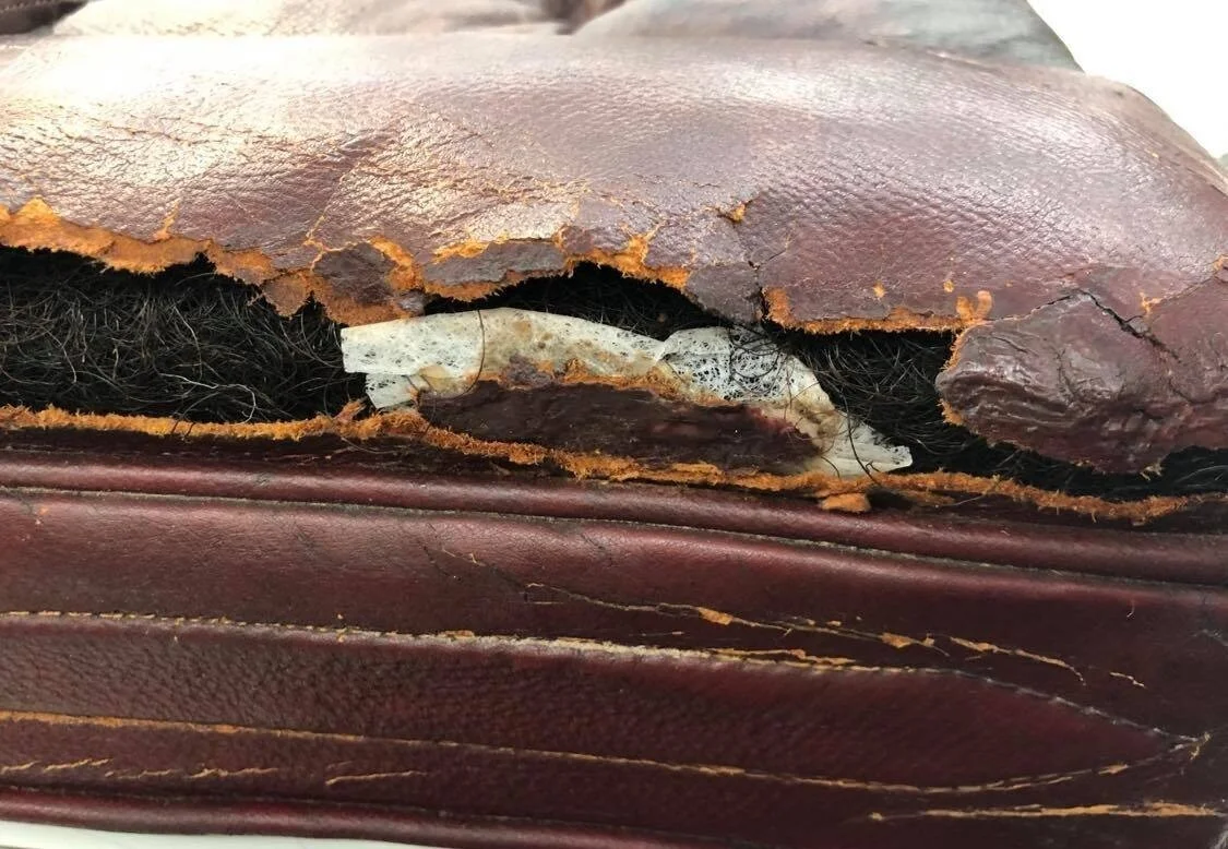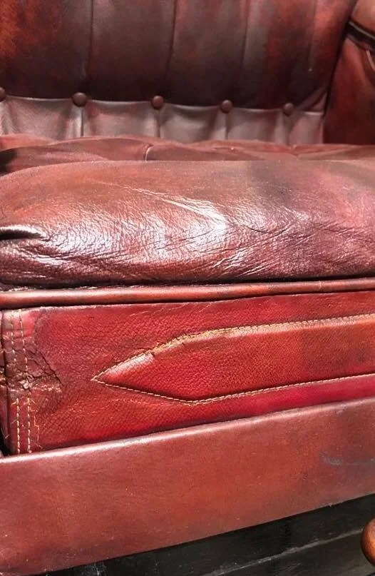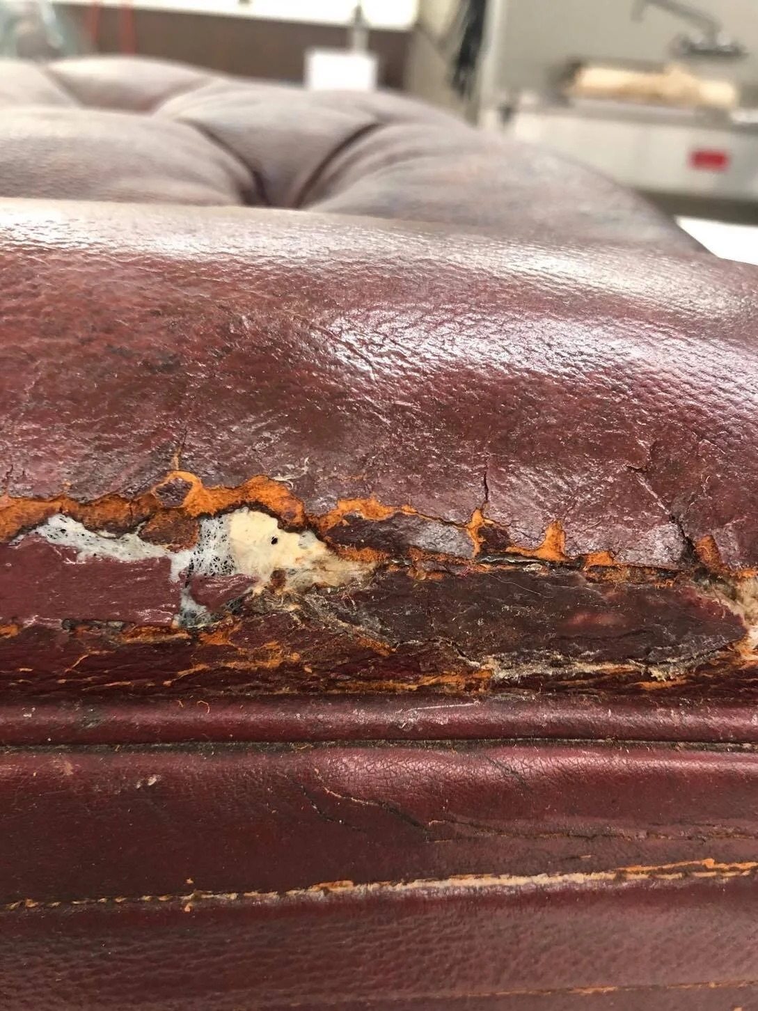 When the paste was fully dried, all consolidated locations were in-painted with Winsor and Newton artist’s acrylics to better match the natural colors of the burgundy leather. A small amount of Liquitex acrylic gloss medium and varnish was mixed with the acrylic to better mimic the sheen of the original leather. This treatment was done to both detachable driver’s and passenger’s cushions, all armrests in the front of the vehicle, as well as select edges of cushions in the back of the vehicle.